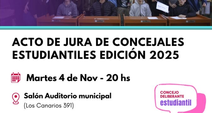 Se realizará el martes 4 de noviembre el acto de Jura de los concejales estudiantiles edición 2025 en el Salón Auditorio municipal (Los Canarios 391) a las 20 hs.