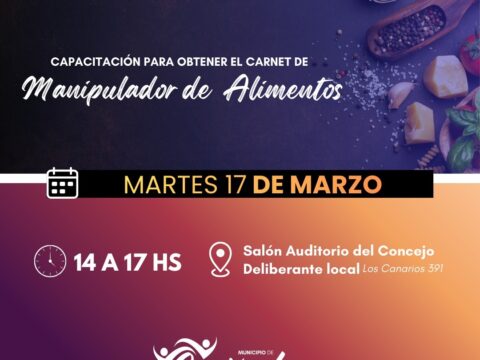 El martes 17 de marzo se realizará una nueva capacitación para obtener el carnet de manipulador de alimentos. Será de 14 a 17 hs en el Salón Auditorio del Concejo…