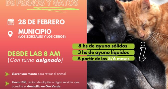 El sábado 28 de febrero desde las 8 hs. en el edificio municipal, la Asociación Amigos de los Animales y el Municipio llevarán adelante el primer operativo de castración de perros y gatos de 2026.