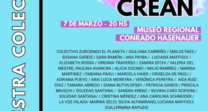 En el marco del mes de la Mujer se realizará la muestra colectiva “Ellas crean”. Será el 7 de marzo a las 20 hs en el Museo Conrado Hasenauer (Los Tordos 241). Allí artistas locales y de la región presentarán sus producciones artísticas en pintura, dibujo, grabado, fotografía, escultura, arte textil y técnicas mixtas.