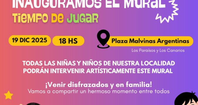 Los invitamos el miércoles 19 de diciembre a las 18 horas para inaugurar este mural denominado “Tiempo de jugar” en la Plaza Malvinas Argentinas (Los Paraísos y Los Canarios).
