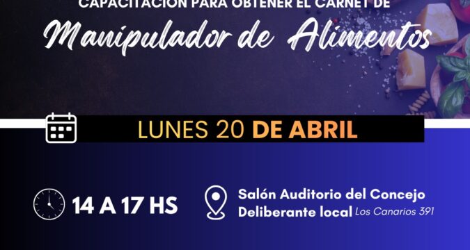 El lunes 20 de abril se realizará una nueva capacitación para obtener el carnet de manipulador de alimentos. Será de 14 a 17 hs en el Salón Auditorio del Concejo Deliberante local, ubicado en Los Canarios 391.